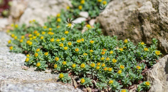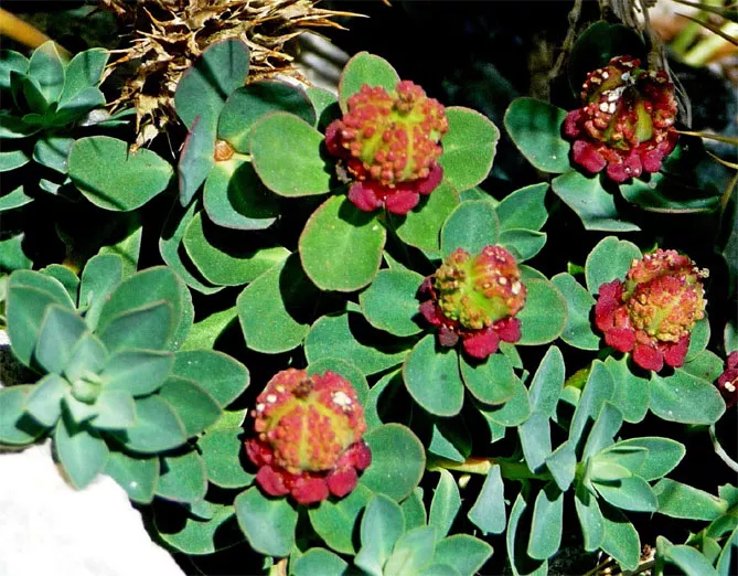 Небольшой многолетник Молочай головчатый (Euphorbia capitulata) достигает до 10 см в высоту, с голубоватыми листьями и выразительными цветками, собранными в небольшие головки. Цветет поздней весной, создавая интересный акцент в каменистых садах.