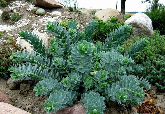 В каменистых садах часто встречается красивый миртолистный молочай (E. myrsynites) с ползучими длинными розетчатыми побегами. Растение до 20 см высотой. Стебли мясистые, светло-сине-зеленого цвета. Соцветия головчатой формы состоят из цветков и светло-зелено-желтых нижних листиков оболочки. Вид имеет симпатичные, толстые, вощеные, яйцевидные листья.