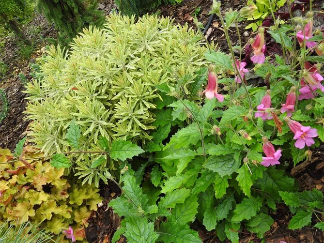 - Сорт «Эскот Рэйнбоу» Ascot Rainbow – полувечнозеленое многолетнее растение с декоративными листьями, которые выделяются желтым краем вокруг листовой пластинки. Достигает 40 см. Побеги у основания становятся деревянистыми, но над ним относительно мягкие и могут слегка полегать. Листья ланцетные, 3-7 см длиной, 1 см шириной. В молодых приростах оранжевые, затем серо-зеленые с неравномерным желтым краем. Цветет Ascot Rainbow с середины апреля по июль. Растение полностью морозоустойчиво, хорошо зимует.