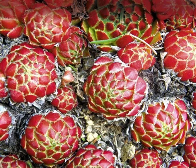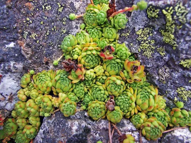 Притиснуті до землі розетки листя досягають 3-5 см у висоту. На початку літа над розетками з'являються квіткові пагони, що досягають висоти 20 см, на яких у кінці липня-на початку серпня з'являються квіти в інтенсивних відтінках червоного, білого, жовтого. Після цвітіння вони перетворюються на листівки з насінням. Коли квіти висохнуть, розетка, що випустила їх, відмирає, навколо неї виростають маленькі дочірні розетки. Молоді рослини швидко вкорінюються в землі, завдяки чому колонія з року в рік розширює територію.