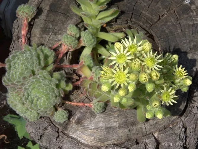 - Влітку з найстаріших рослин ростуть квіти. Вони мають форму маленьких зірочок, мають відтінки рожевого та білого. У міру росту квіткового пагона, а потім дозрівання насіння, розетка, яка їх випустила, поступово зав'ядає.