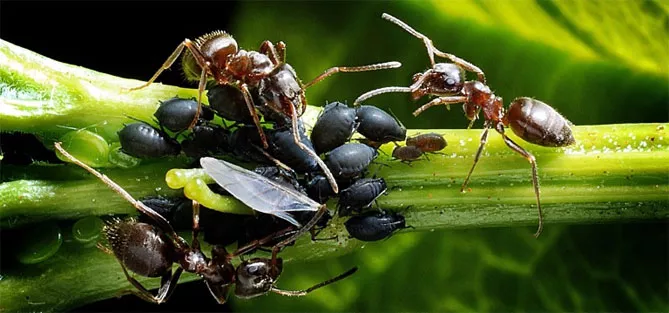 - Мурахи живляться солодкими виділеннями попелиці, яка може завдати реальної шкоди рослинам. Вони захищають попелицю від природних ворогів (сонечок). Деякі види створюють власні колонії попелиць – личинок попелиць на зиму переносять глибоко в мурашник, а навесні дорослих комах знову виводять на вулицю, де вони можуть живитися рослинами і постачати мурахам необхідну для них росу.
