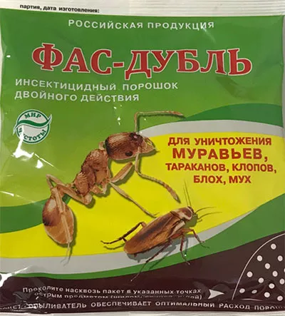 Фас ефективний проти всіх видів мурах, клопів, тарганів. Для знищення шкідників порошок наноситься тонким шаром в місця скупчення і переміщення шкідників.