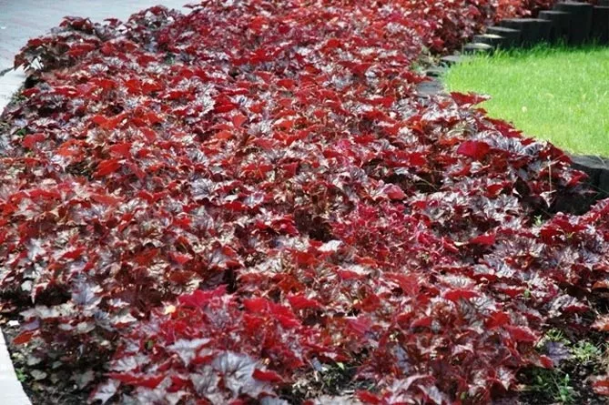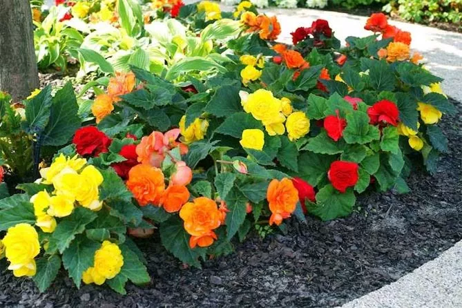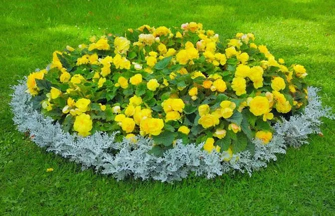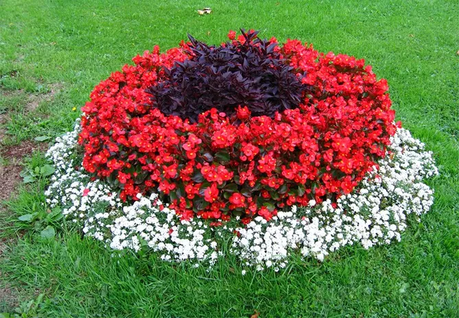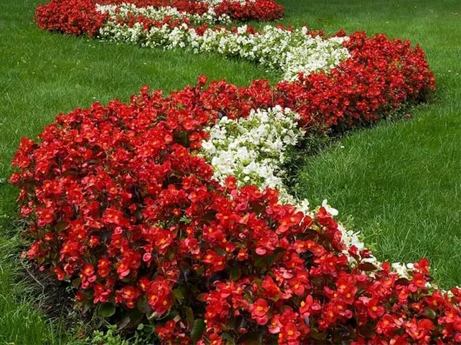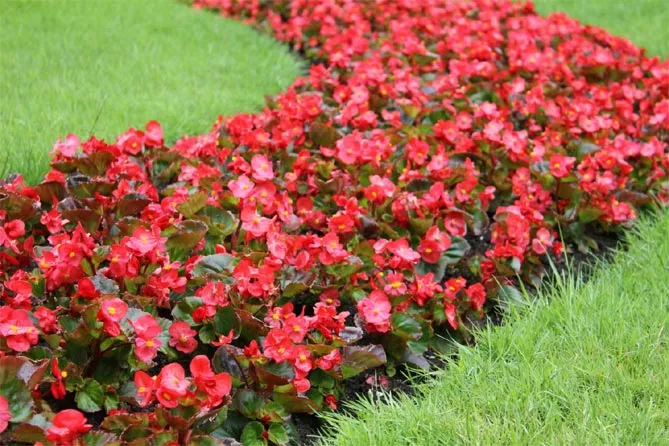 Красиві бордюрні квіти – бегонія (Begonia semperflorens). Цей однорічник зазвичай виростає до 50 см у висоту, її можна вести нижче якщо вибирати низькі сорти. Цвіте бегонія з червня по жовтень. Колір квіток – білий, жовтий, лососевий, помаранчевий, червоний. Цей вид дуже легко виростити, він красиво виглядає по межах і периметру.