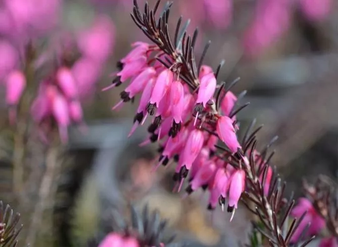 Чагарник схожий на верес, але це різні види рослин. Еріка цвіте з лютого (січня, якщо погода хороша) до квітня. Квіти мають форму глечиків, листки нагадують голки на стеблах і ростуть перпендикулярно до них. Чагарнику потрібна слабко кисла, проникна та помірно волога почва. Еріку слід саджати на сонячних або напівтінистих місцях.