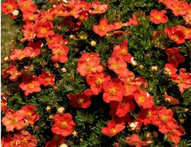 П'ятилистник кущиковий або перстач підходить для створення білих, жовтих або червоних бордюрів. Чагарник досягає висоти не більше 100 см. Перстач має сріблясто-зелені листки, цвіте з травня – червня по жовтень. Квіти перстачу бувають жовтими, білими, помаранчевими або у відтінках червоного.