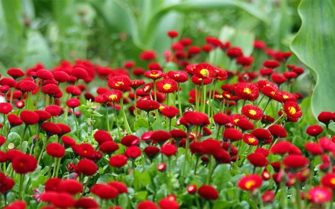 Декорativні квіти маргаритки (Bellis perennis) – дворічні рослини досягають висоти 4-20 см. Створюють розетки з лопатчастих листків. Кошики суцвіття мають біло-жовтий або рожевуватий відтінок. Маргаритка цвіте з березня по липень. Ці квіти часто вирощують в садах.