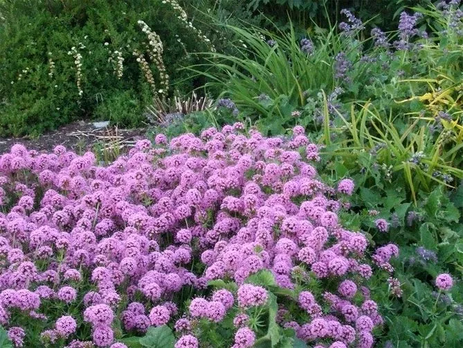 Маленькі пурпурно-рожеві квіточки зібрані в суцвіття і ростуть на низьких квітконосах довжиною 20 см. Цвітіння триває з травня по вересень (за сприятливої погоди – до жовтня), основна інтенсивність цвітіння припадає на червень. Через 3-4 роки кущ цвіте все повільніше і поступово вмирає.