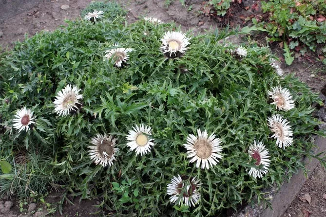 Це дворічна рослина з родини айстрових, зростає в альпійських регіонах Південної та Центральної Європи. Надземна частина рослини у вигляді розетки досягає 20-15 см у діаметрі. Рослина характеризується дуже укороченим стеблом або його відсутністю. Листя перисте, колюче. Цвіте колючник з липня по вересень. На верхівці розетки з'являються розкішні сріблясто-білі квіткові кошики діаметром 7-15 см. Суцвіття відкривається тільки на сонці і закривається під впливом підвищеної вологості. Рослину використовують для посадки в альпінаріях, для сухих букетів.