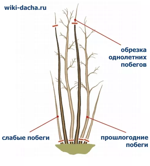 Обрізають стебла, які плодоносили, і знову видаляють зайві молоді пагони. Відростки можна обрізати прямо біля землі або на 20 см вище поверхні – тоді пагони, які проб'ються наступного року, будуть менш численними, але сильнішими.