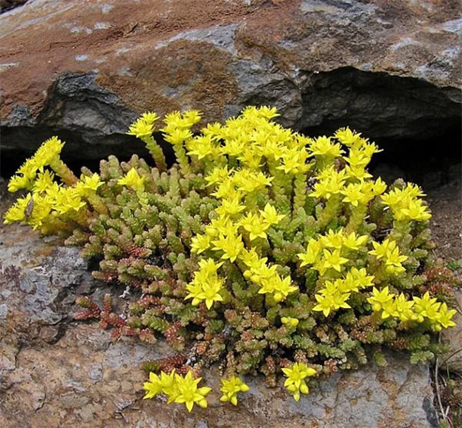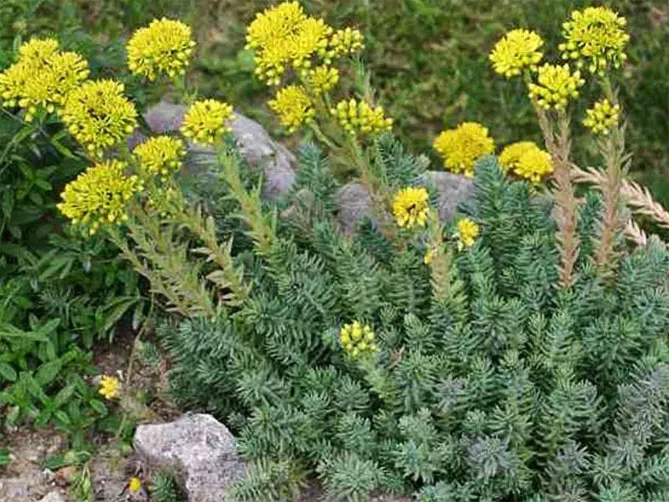 Прикраса скельного очитку – золотисто-жовті квіти, що цвітуть з липня по вересень, зібрані в сферичні парасольки утворюють різнобарвний килимок. Квіти скельного очитку невеликі, їх пелюстки тонкі, гострі.