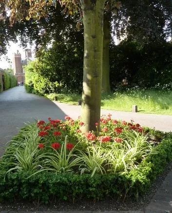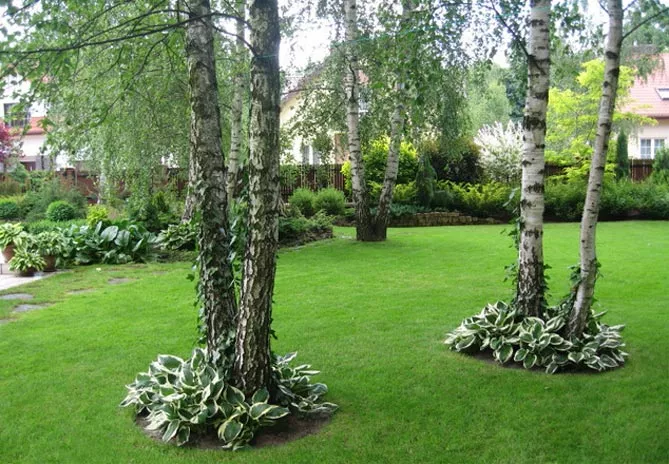 Квітники з сезонних квітів під самітніми деревами також чудово підійдуть до компанії. Різнобарвні острівці не лише виглядають привабливо, але й підкреслюють красу дерева, колір кори. Вони роблять дерево на газоні помітнішим, а композиція виглядає вишуканою і завершеною, просто ідеальною.