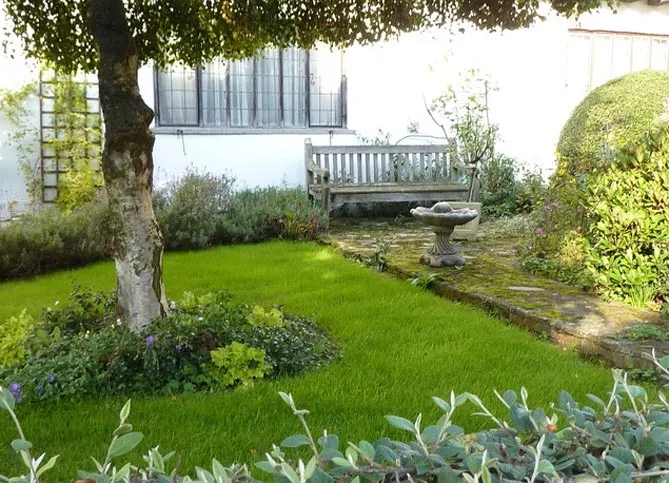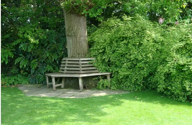 В англійських садах модно ставити спеціальні лавки, що оточують дерево з усіх боків. В ідеалі вони гармонують з навколишнім середовищем. Подушки на дошках зігріють цей куточок.