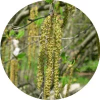 | Сережки. Цвіте задовго до розвитку листя. Чоловічі квіти зосереджені у жовтих сережках. | Листки складено складчасто, мають вигляд звивистих, яйцеподібних або круглих, одиночних, довгочерешкових. Край листової пластинки зубчастий. Лист має 5-7 пар жилок, темно-зелений. |