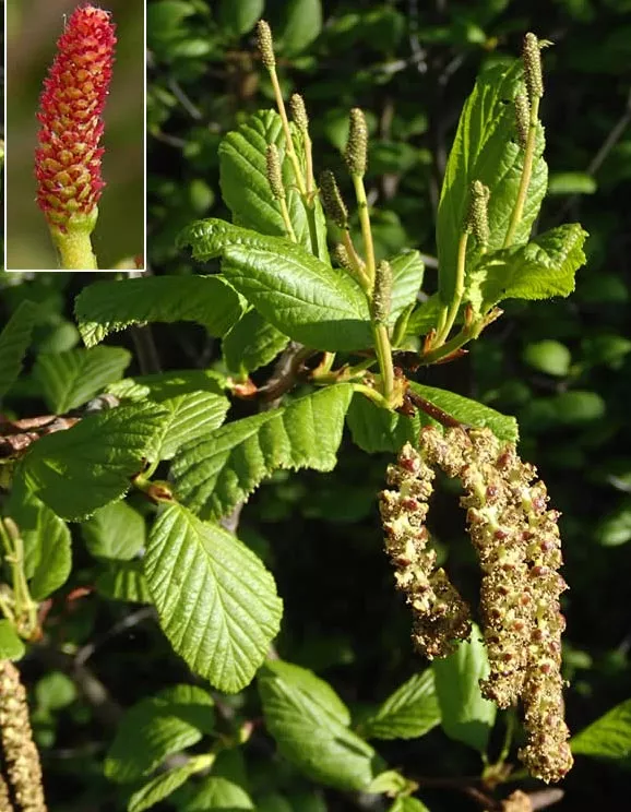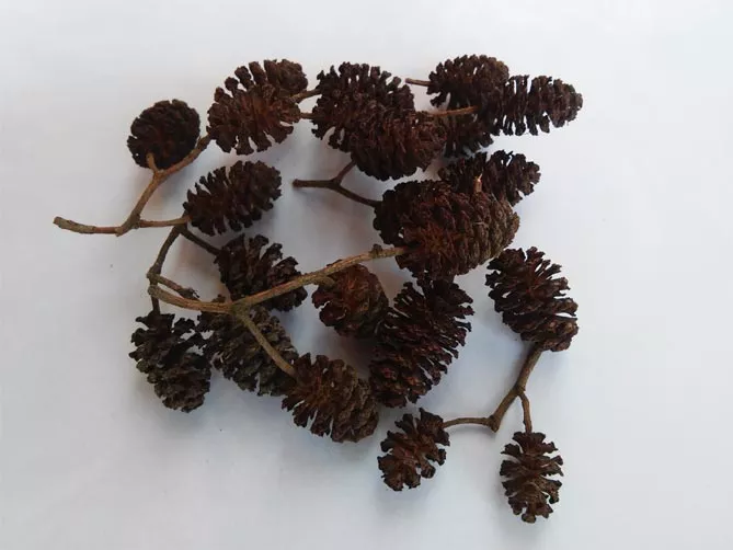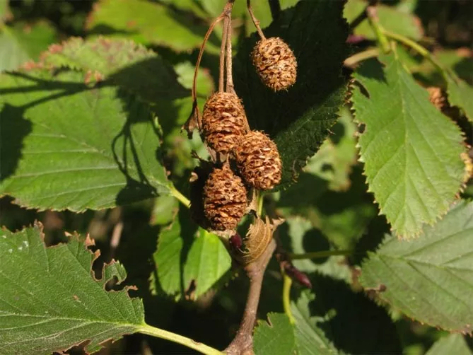 | Сережки – чоловічі суцвіття. | Листки – яйцеподібні або еліптичні, завдовжки до 6 см, загострені, з подвійними різаними краями. Жилки виразно видно, у кількості 5-10 пар, у кутах злегка опушені. | Стиглий плід – шишка. Плід кулястий або яйцеподібний, сильно здерев'янілий, нагадує виглядом крихітні соснові шишки. Містять горішки. Вони залишаються на рослині надовго. |