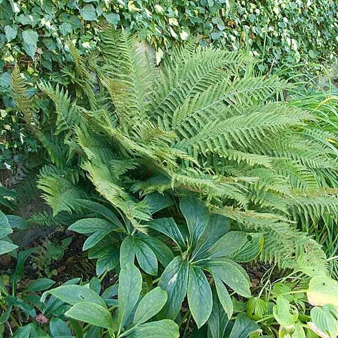 Садовый вид папоротника Страусник обыкновенный (лат. Matteuccia struthiopteris) достигает 80 см. Достаточно распространен в России, растет в Средней Полосе, Забайкалье, Приморье, Тюменской, Иркутской областях и других регионах. Вид особенно элегантен, с крупными прямостоячими листьями красивого нежно-зеленого цвета. Его также называют черный папоротник или разнолистник, он обладает большим очарованием и создает величественный эффект. Произрастая естественным образом на берегу ручьев, вид идеально подходит для оживления берегов водоема! Его лучше сажать в группе по 5-10 штук.