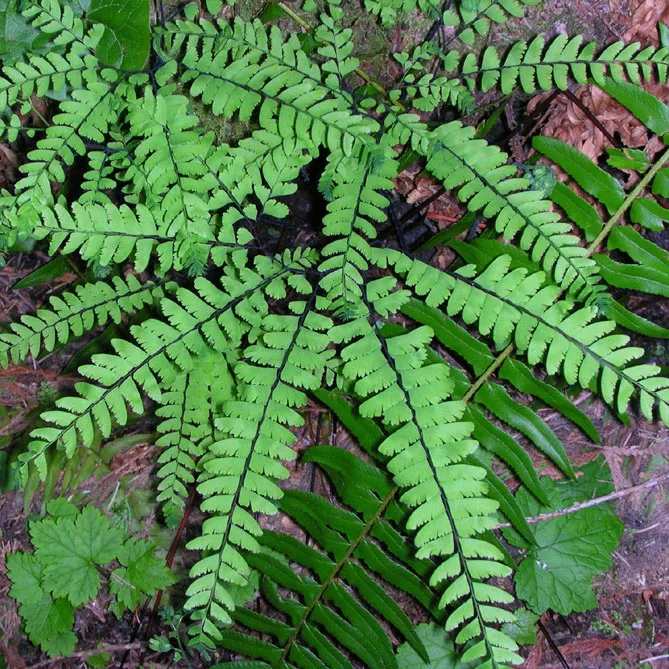 Адиантум стоповидный (лат. Adiantum pedatum) – папоротник отличается чрезвычайно легкой, тонкой, хрупкой листвой. Черные черешки резко контрастируют с нежным зеленым цветом листьев. Ценит слабокислые почвы, но терпит известняк. Высота растения – 60 см.