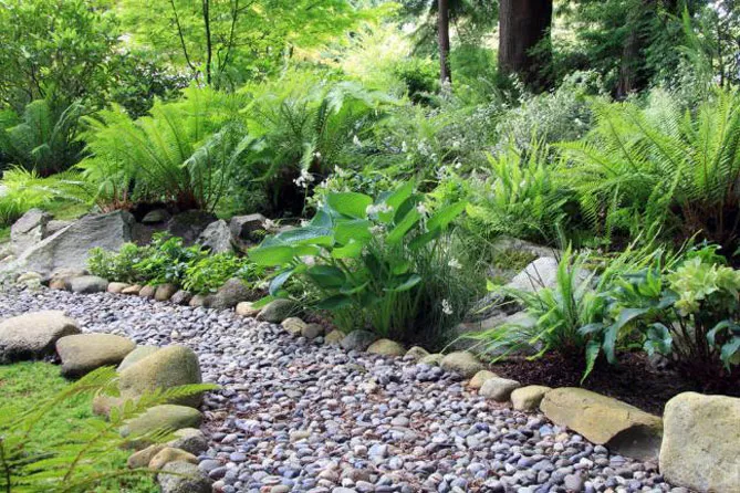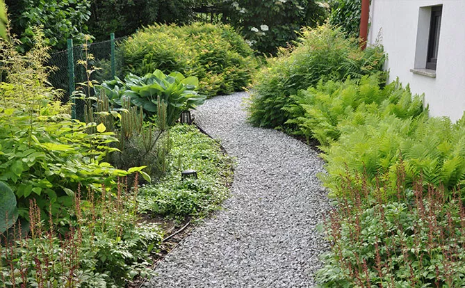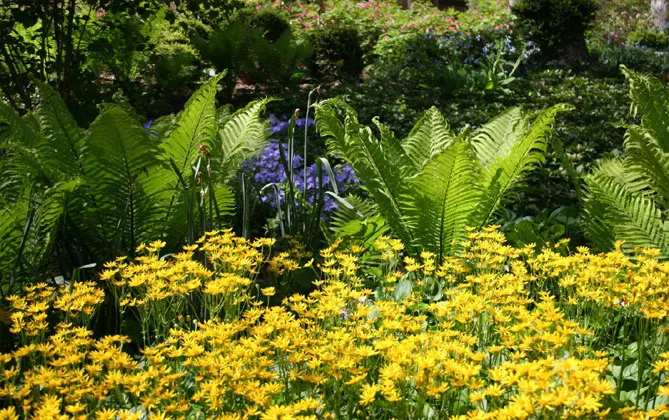 Таким образом, вы получите сад в современном стиле с четкими линиями и спокойными цветами. Самые большие папоротники обеспечивают структурированный фон, их можно посадить на заднем плане клумбы. Они создают довольно сдержанный декор в прекрасном зеленом оттенке, который будет оттенять более яркие цветы, которые можно посадить перед ними.