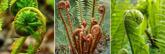 Фото. Фиддлхеды – свернутые листья молодого папоротника. Слева направо, Щитовник мужской (Dryopteris filix-mas), Щитовник Уоллича (Dryopteris wallichiana), Страусник обыкновенный (Matteuccia struthiopteris).