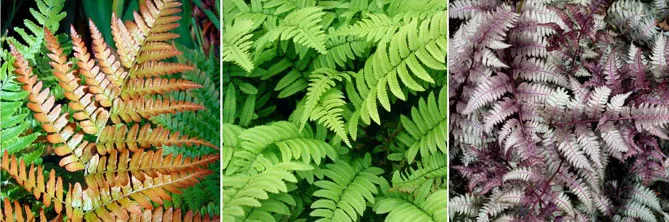 Фото. Ветви папоротника могут приобретать красивые цвета: Щитовник красносорусовый, Щитовник цикадовый, Кочедыжник ниппонский «Пиктум».