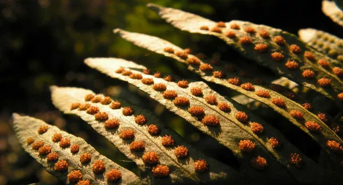 Папоротники не дают ни цветов, ни семян. Вместо этого у них есть споры – очень мелкие частицы, похожие на пыль, которые они производят в огромных количествах. Споры содержатся в мешочке, называемом спорангий. Спорангии часто сгруппированы на нижней стороне листьев. После созревания они раскрываются и выпускают споры, разлетающиеся по ветру.