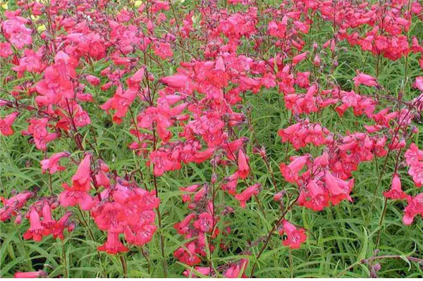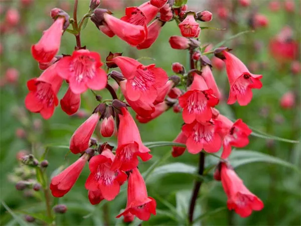 - Пенстемон бородатый (Penstemon barbatus) – самый распространенный. Имеет длинные листья (до 20 см), цветет с начала лета до поздней осени, его красные цветки собраны в метельчатые соцветия. Обычно вырастает до 80 см, но доступны низкие сорта (достигающие 5 см – они отлично подходят для выращивания в контейнерах).