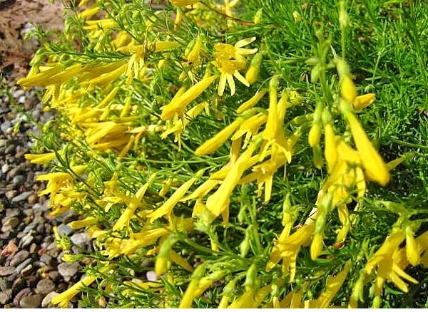 - Пенстемон сосноволистный (Penstemon pinifolius) – высотой 15-20 см, с игольчатыми вечнозелеными листьями и мелкими темно-оранжевыми цветами, цветущими все лето. У сорта «Мерси еллоу» Mersea Yellow – желтые цветки появляются в мае – августе. Требуется кислый субстрат.