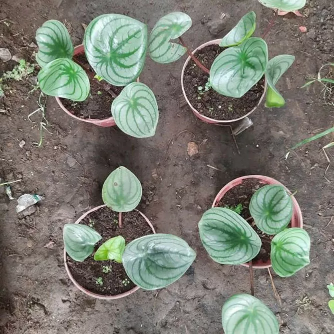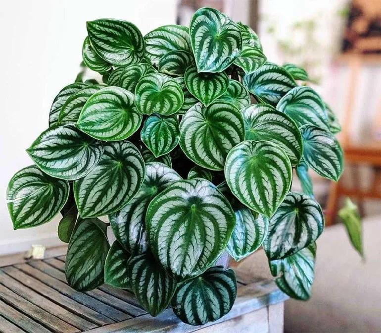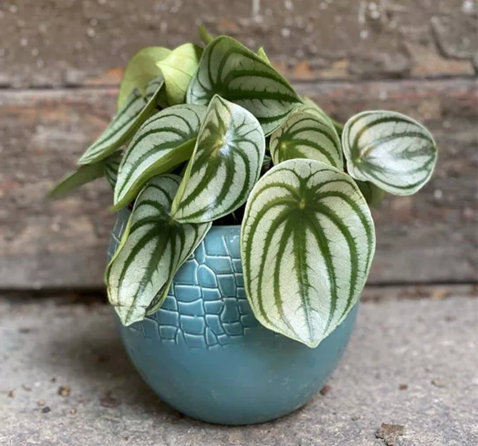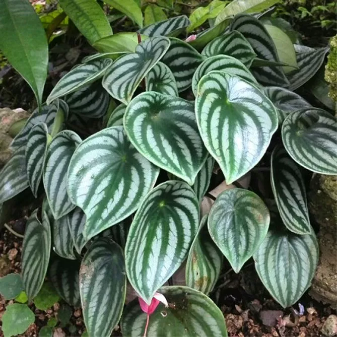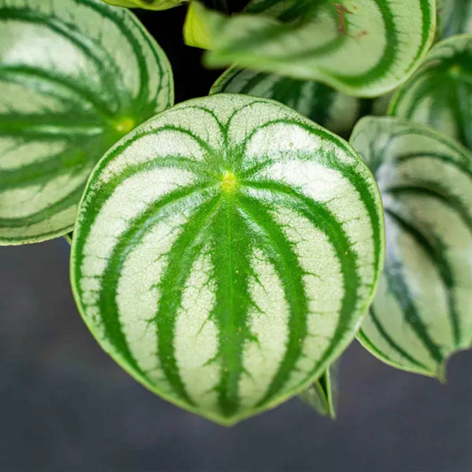 Пеперомия арбузная (Peperomia watermelon) – вид с декоративными листовыми пластинами, напоминающими корку арбуза и пурпурными стеблями. Высота растения – 30 см.