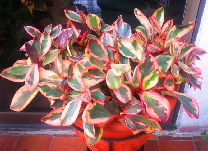 Пеперомия клузиелистная (Peperomia clusiifolia) – вечнозеленое растение с мясистыми короткими ветвистыми, иногда ползучими стеблями. Часто побеги имеют красноватый цвет. В высоту достигает 20-30 см. Листья мясистые, овальные, тупоконечные, длиной 15 см с пурпурной каймой.