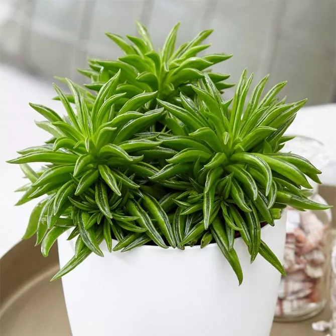«Хэппи Бин» Happy Bean – чрезвычайно привлекательный сорт с листьями, похожими на стручки зеленой фасоли. Листья мясистые, удлиненные, сочного, светло-зеленого цвета. Благодаря сильно загнутым вверх краям они создают форму лодочки с открытым темно-зеленым окошком вверху. Листья растут не вертикально, образуют забавную шляпку в форме розетки. Happy Bean вырастает до 30 см.