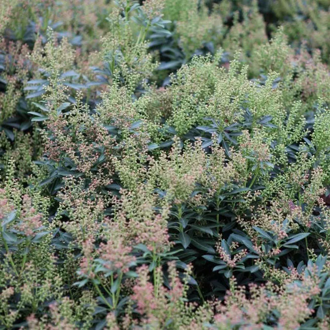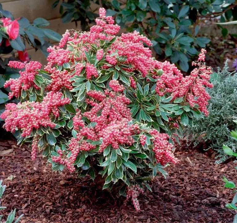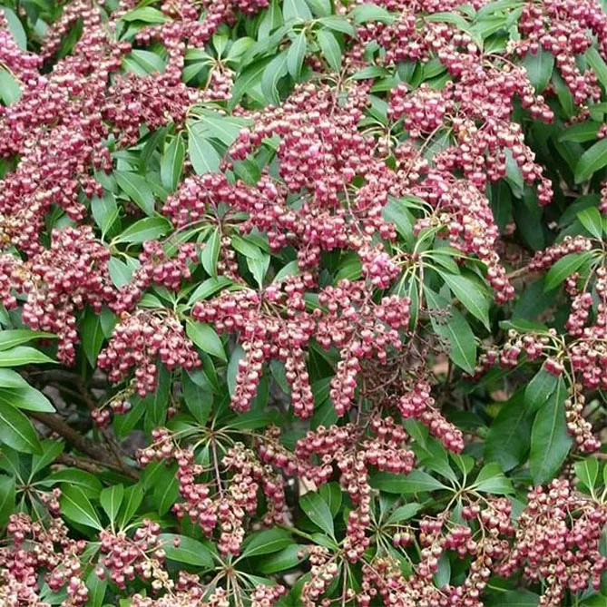 Пиерис японский имеет молодые побеги багрово-красного оттенка. Он внесет много красок в живую изгородь или на задний план клумбы! Хотя его выращивают в основном из-за его оригинальной листвы, пиерис имеет красивое весеннее цветение, иногда очень впечатляющее. Цветки – мелкие белые или розоватые колокольчики, собранные в соцветия-метелки.