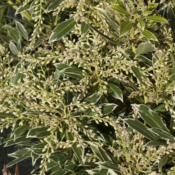Компактный сорт пиериса японского «Флэминг Сильвер» (P. japonica Flaming Silver) цветет с апреля по май. Высота – 1,25 м. Листья с белой окантовкой, молодые листья ярко-красные, затем становятся зелеными. Белые цветы.