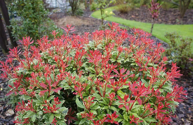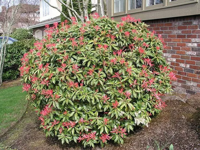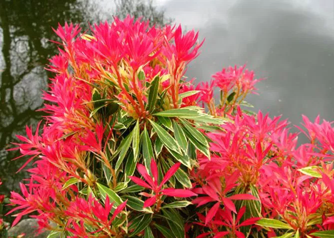 Сорт пиериса «Форест Флэйм» (P. japonica Forest Flame) цветет с апреля по май. Высота в зрелом возрасте – 1,5 м. Молодые листья ярко-красные, затем становятся розовыми, кремовыми, зелеными. Весной куст расцветает белыми цветами. Это сорт с большим развитием, идеально вписывается в живую изгородь.