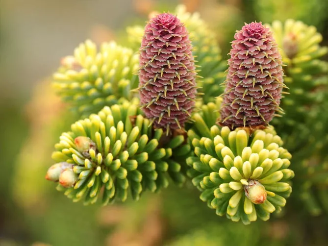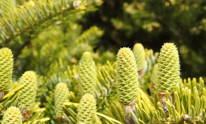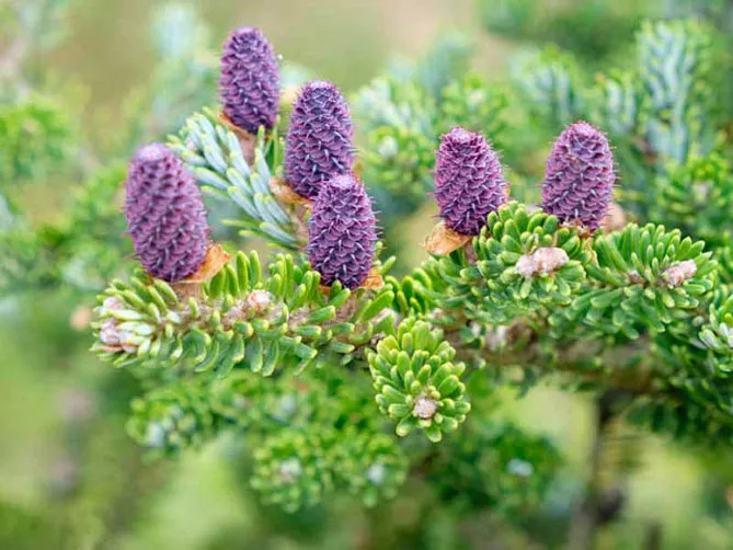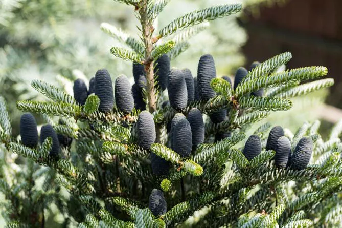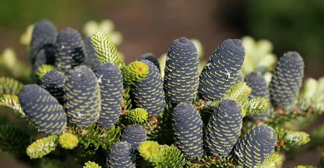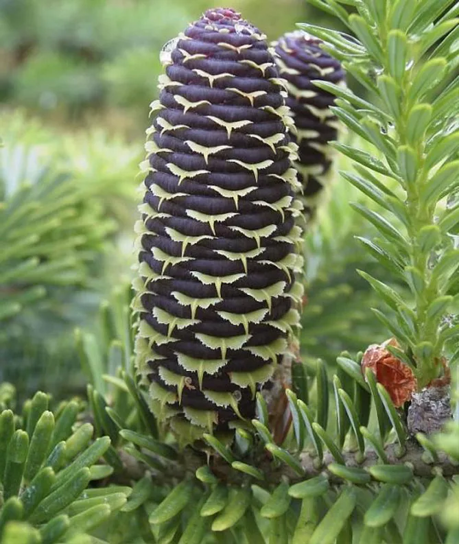 - Шишки. Уже на молодых растениях (даже высотой 1 м) можно увидеть характерные сине-фиолетовые, узкие, цилиндрические, прямостоячие, длинные (7 см) шишки. Они появляются после нескольких лет выращивания. Шишки обычно растут группами по несколько штук рядом, со временем меняют цвет на коричнево-зеленый, при созревании не опадают с дерева, а рассыпаются.