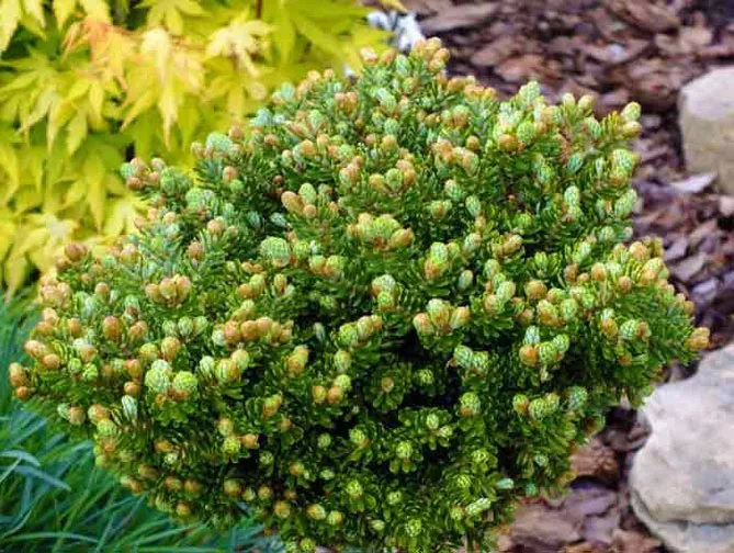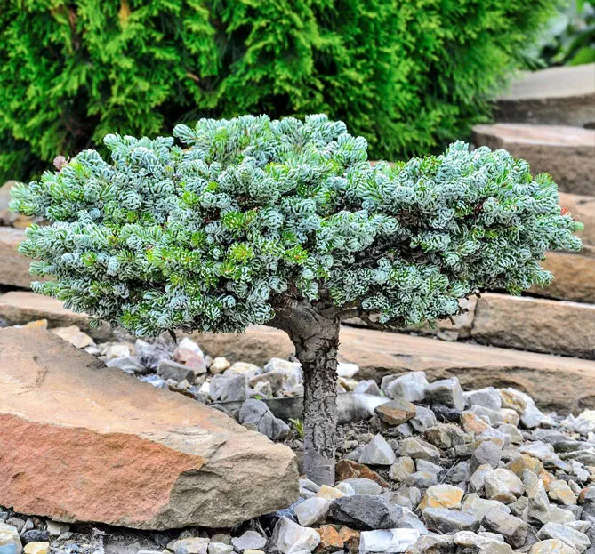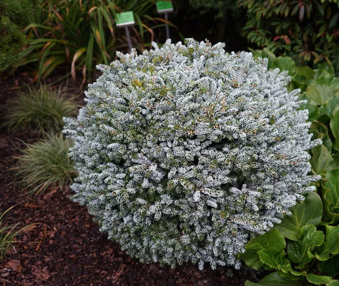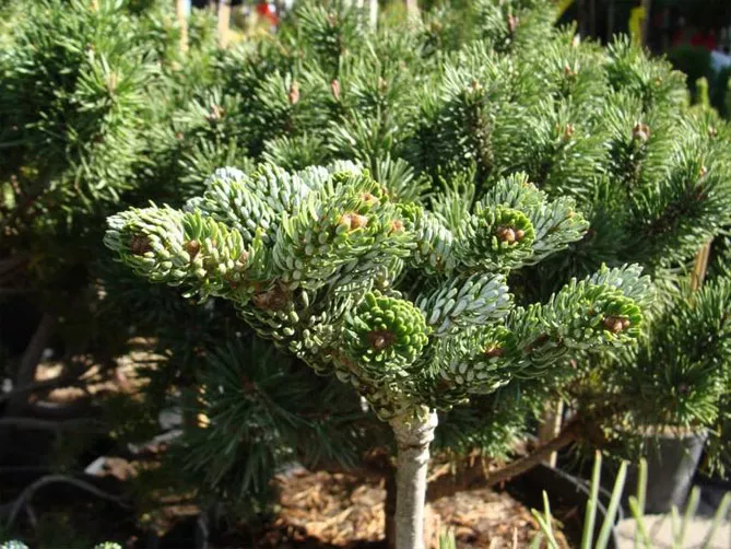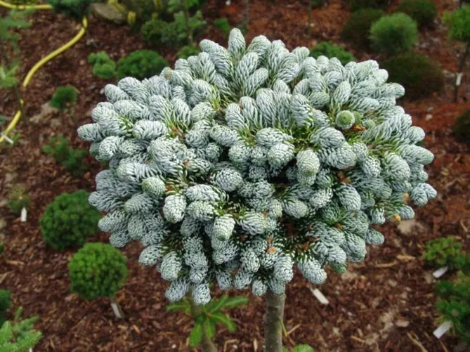 Пихта «Пиноккио» – относится к карликовым сортам с характерной шаровидной формой. Обычно прививают на штамбе.