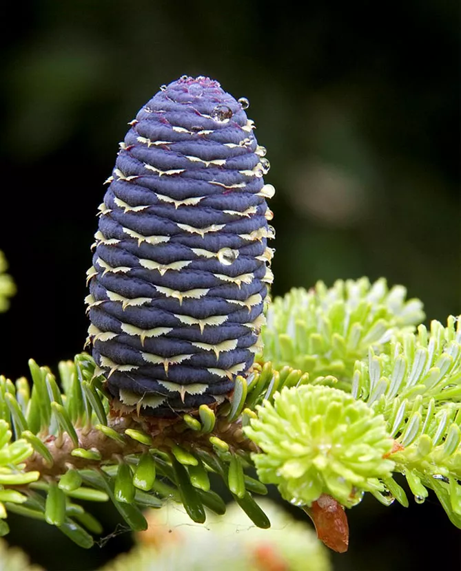 - Плоды – шишки до 7 см длиной, с пурпурным налетом, по форме цилиндрические. Шишки сначала фиолетово-голубые или пурпурно-фиолетовые, со временем становятся зеленовато-коричневыми. Появляются шишки на ветвях через несколько лет после посадки дерева, они жесткие, вертикально направленные вверх, появляются даже на деревьях метровой высоты. При созревании разваливаются.