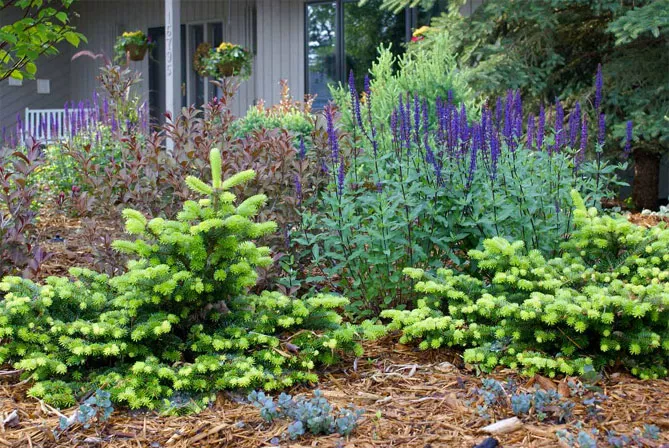 Пихты хорошо представлены посаженные с цветными лиственными кустарниками: