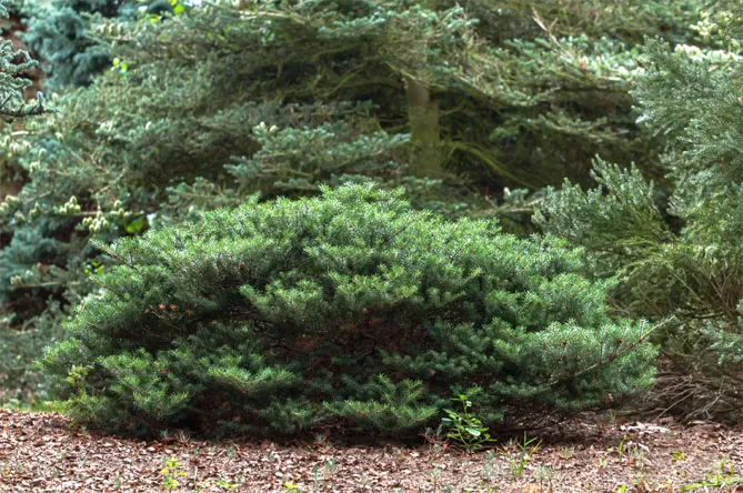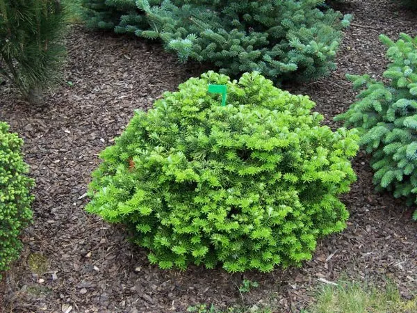 - Лучший вариант мульчи – перекомпостированная сосновая кора, без мусора, веточек. Слой мульчи должен иметь толщину 5-8 см. Кора сосны поможет поддерживать правильный уровень pH для пихты.