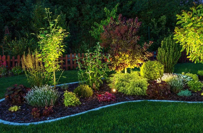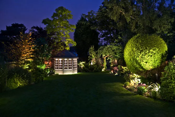 Освещение сада способствует вечернему расслаблению на открытом воздухе. В садах популярны лампы на верхних или нижних стойках, установленных вдоль дорожек. Часто на лужайке устанавливают прожекторы. Точки освещения предусматривают на тротуарах.