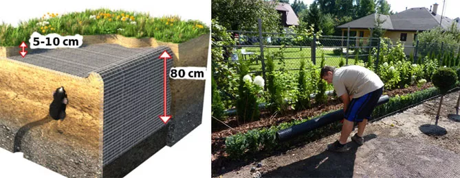 - Кроты в саду. Антикротовые сетки – эффективное решение. Применяют сетки на этапе закладки сада, потом это станет затруднительно. Пластмассовые сети дешевле, чем металлические изделия и являются препятствием для кротов, не препятствуя росту растений. Сеть размещают примерно на 10 см ниже поверхности газона, на 30 см ниже поверхности огорода. После разворачивания сетки укладывают слой почвы, высевают газон.