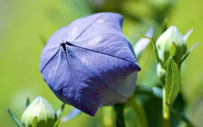 Почки крупноцветкового колокольчика также выглядят интересно, они образуют зеленые или фиолетовые маленькие воздушные шарики, которые раздуваются и появляется цветок. Цветок открывается вполне сформированным и сразу с окончательным размером.