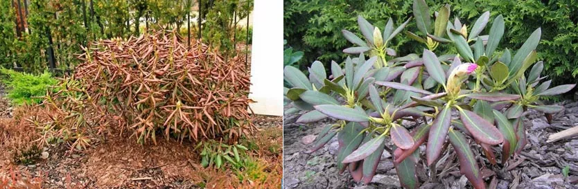 Рододендроны устойчивы к морозу. Но чрезвычайно суровые зимы с большими колебаниями температуры могут нанести ущерб листьям и однолетним побегам. Симптом замораживания побегов – покоричневение листьев, начинающееся с верхушек и распространяющееся по краям листа.