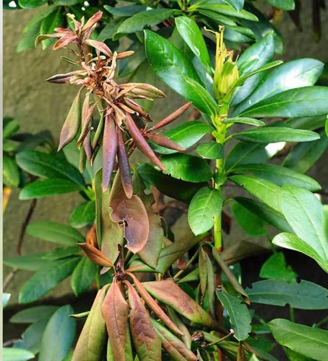 Симптомы фитофторы появляются на кончиках побегов рододендронов и других представителей семейства вересковых (Ericaceae). Болезнь развивается при избытке влаги в почве.