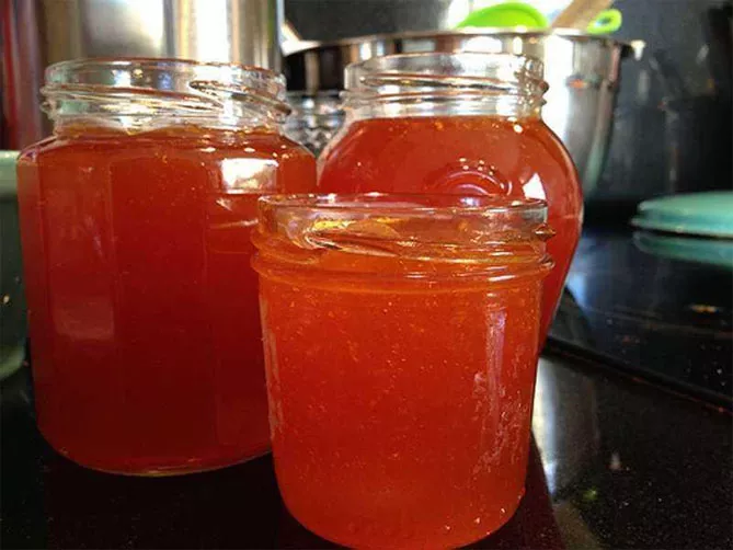 - Помешивая на слабом огне, варить около 20 минут, пока масса не загустеет. Переложить в стерелизованную банку, закрыть и остудить.