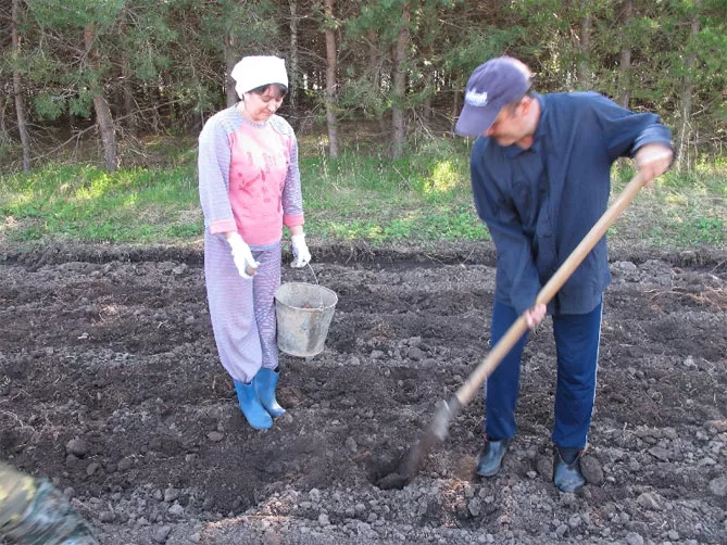 - В лунку кладут по одному клубню картофеля. Клубни до посадки следует прогреть на солнце, чтобы у них образовались ростки.