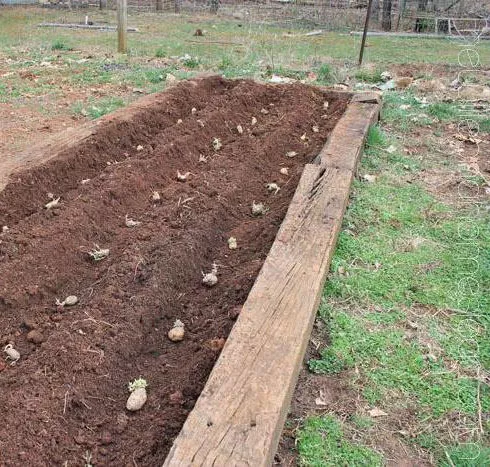 - Планируется посадка картошки в мае. Клубни в траншеях раскладывают с расстоянием 30 см между ними, присыпают землёй.