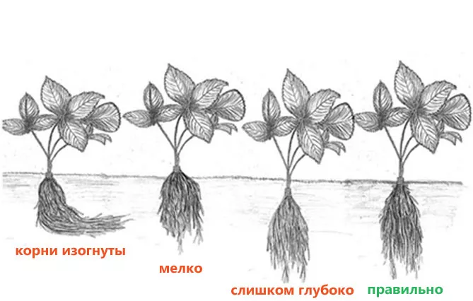 Важно, чтобы корни саженцев были расправлены прямо, потому что изогнутая корневая система подталкивает растение вверх и приводит к высыханию кустика.