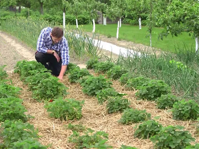 Отлично подходит для мульчирования клубники агроволокно. Не менее хороша солома, пшеничная или ржаная – недорогой и легко доступный материал (к сожалению, не в больших городах), она отлично выполняет свою роль. Соломенная мульча успешно использовалась в посадках клубники на протяжении многих поколений во многих странах. Английское название клубники (strawberry – «соломенная ягода») свидетельствует об этом лучше всего, потому что влажный климат Англии обычно вызывал много проблем у производителей, не использовавших мульчу (созревшие плоды, лежащие на влажной почве, часто гнили, на соломе – никогда).