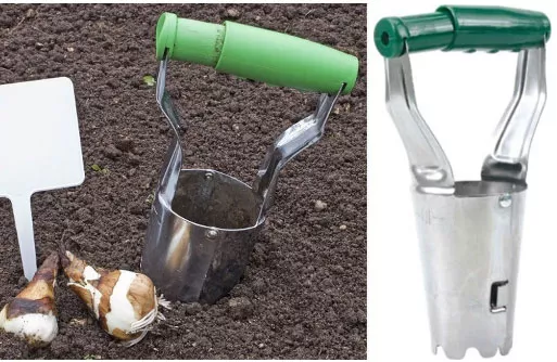 - Луковичные растения удобно сажать в землю специальной сеялкой для луковиц, позволяющей сделать правильное отверстие в земле. Благодаря приспособлению можно быстро выкопать ямку с прямыми стенками, без необходимости копать вокруг. Благодаря уровню, отмеченному на устройстве, можно вырыть отверстие определенной глубины.