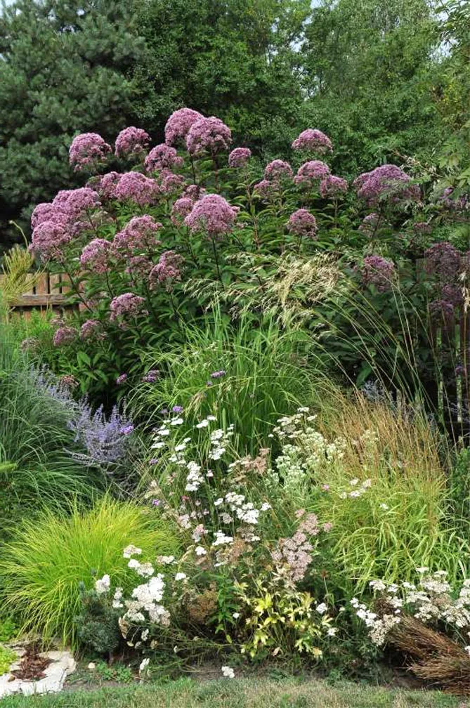 Eupatorium purpureum – Фиолетовый или пурпурный посконник – травянистое многолетнее растение. Хорошо справляется с холодными зимами. Цветет в конце лета густыми соцветиями до 25 см в диаметре, состоящими из розово-фиолетовых цветков. Соцветия расположены на сильных, фиолетовых стеблях. Листья овальные, имеют шероховатую поверхность, достигают длины 10 см. E. purpureum достигает высоты 2 метра, ширины – 1 метр.